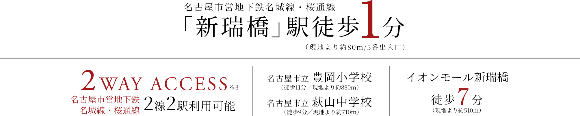 2:「駅前新価」「1min. sta. RESIDENCE」とは、最寄り駅である名古屋市営地下鉄名城線・桜通線「新瑞橋」駅へ徒歩1分(現地より約80m/5番出入口)と通勤通学の時間が短く、