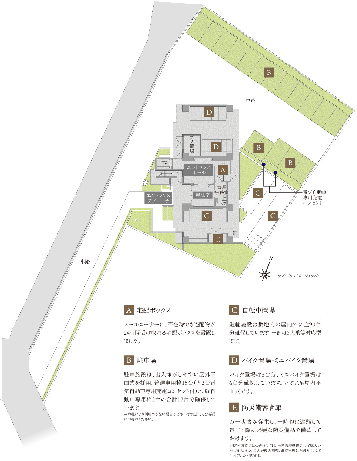 ※掲載の外観完成予想図、エントランスアプローチ完成予想図・ランドプランイメージイラストは図面を基に描き起こしたもので、外観・外構・植栽・色彩等は実際とは異なる場合があります。