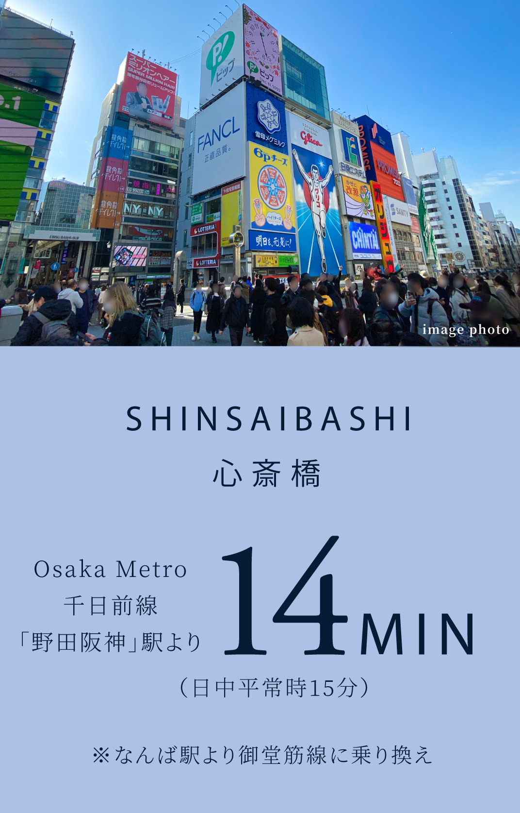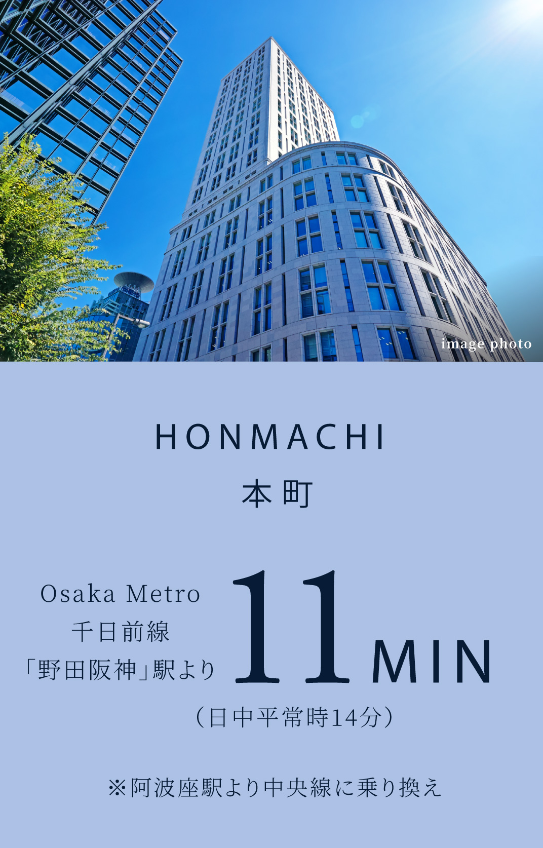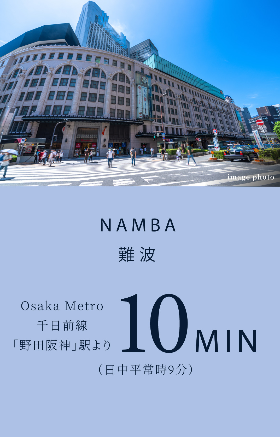 「なんば」駅へもOsaka Metro千日前線「野田阪神」駅※から直通10分(日中平常時9分)。