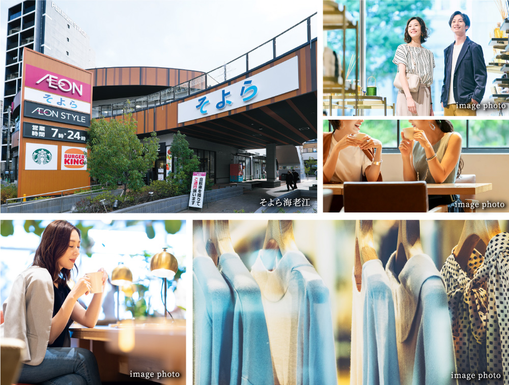 総合スーパーの「イオンスタイル海老江」のほか、ファーストフードやヘアサロンなど、暮らしに役立つショップが集積しています。