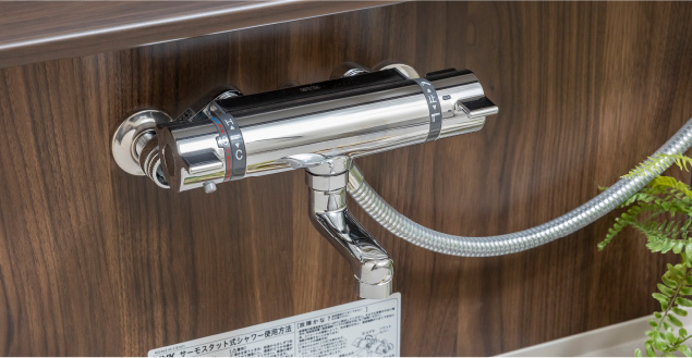 設定された湯温を安定的にキープして供給するサーモスタット付混合水栓。湯温を簡単に調節できます。また、シャンプーなど小物も置ける浴室カウンターも設置しています。