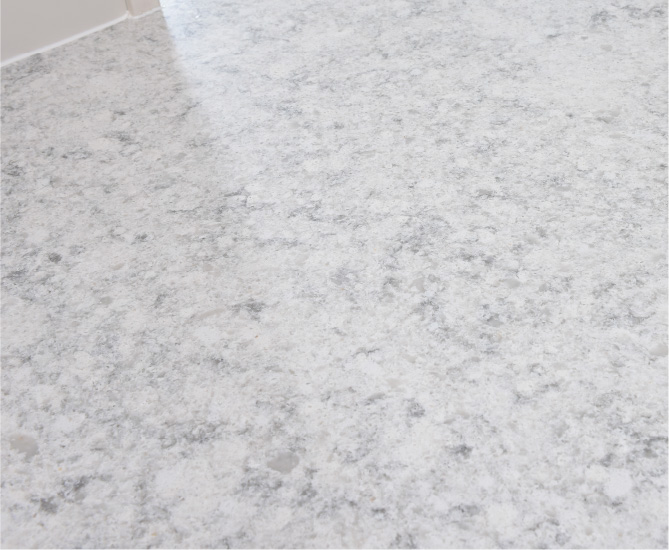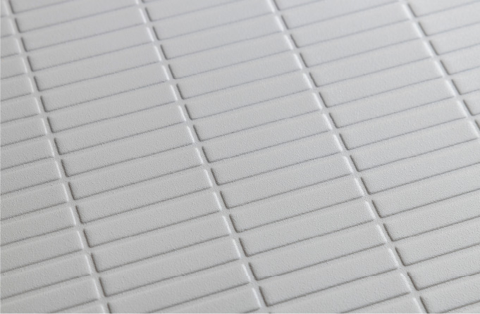 切り出した石をキチンと連続してそろえたようなデザイン。水の表面張力を壊す効果があり、乾きやすく、お掃除がしやすい床です。