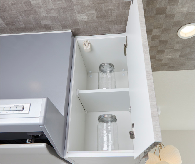 食材や食器、調理器具など多目的に使える収納に便利な吊戸棚を設けました。