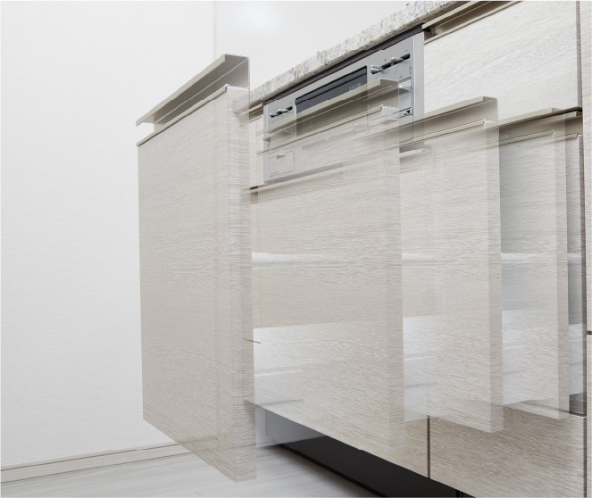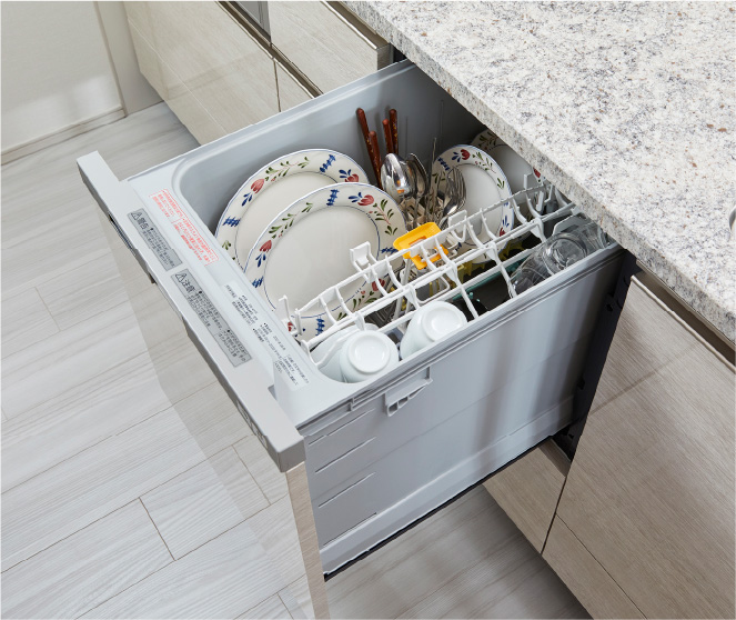 食器の出し入れがしやすいスライド収納タイプの食器洗い乾燥機。家事負担の軽減を図れます。