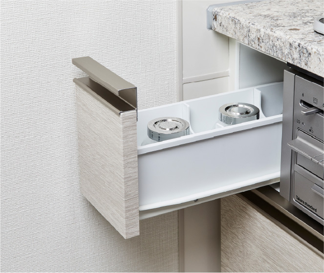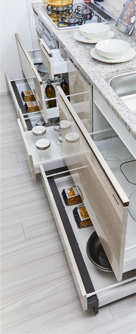 奥のスペースまで有効に活かせ、出し入れもしやすいスライド式収納。大きな鍋から調味料までを効率よく整理できます。