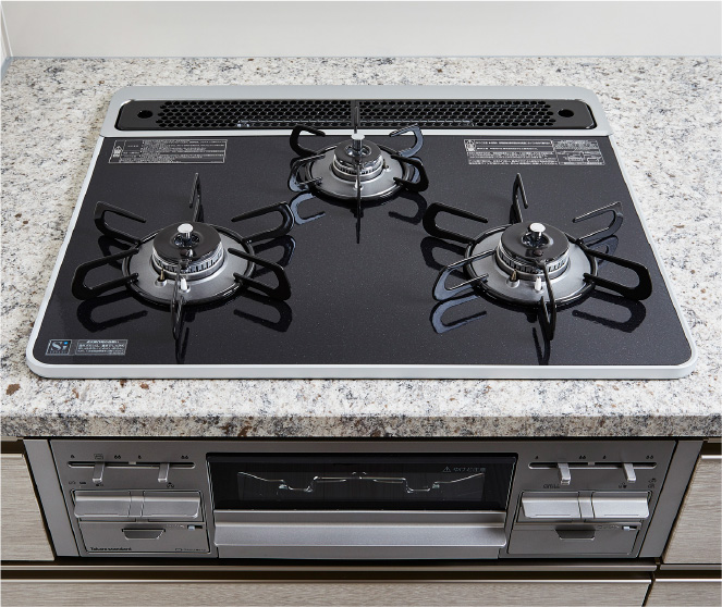 艶があって美しく、汚れが落ちやすくお手入れしやすいグリル付3口ガスコンロ。