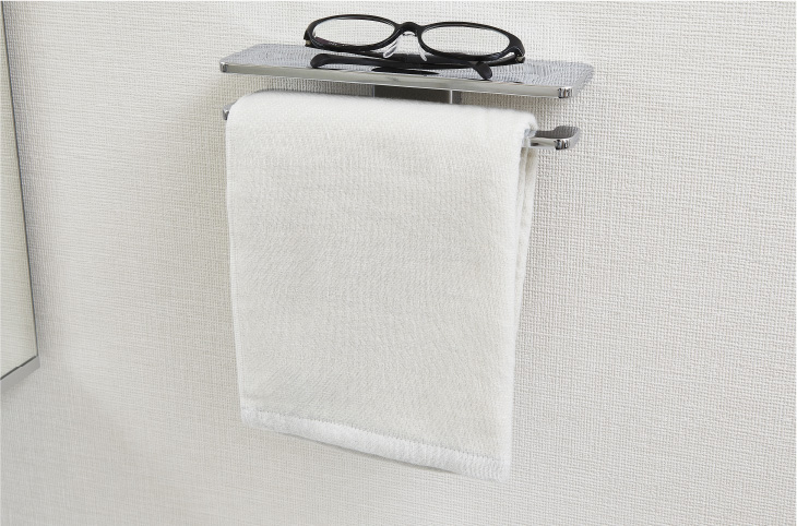 シンプルでスタイリッシュなデザイン性と、実用性を兼ね備えた小物置付のタオル掛け。