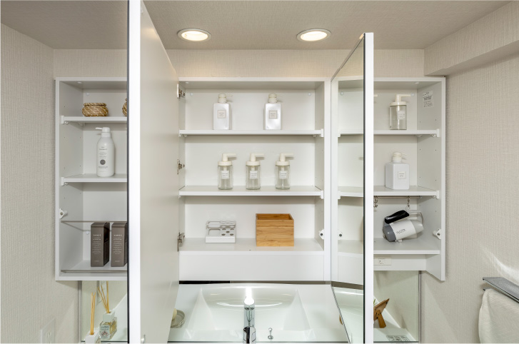 三面鏡の裏には、小物などを収納するスペースを確保しました。