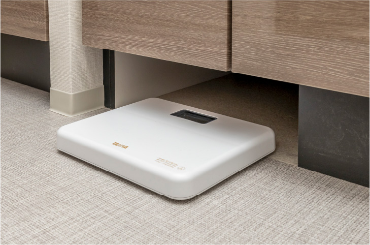 置き場所に困るヘルスメーターを、洗面化粧台の下にすっきり収納できます。
