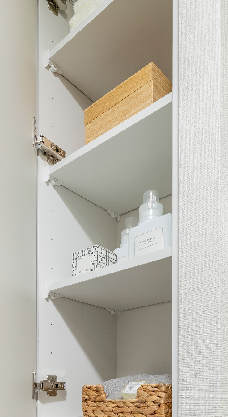 タオル類などの収納に便利なリネン庫をパウダールームに設けました。