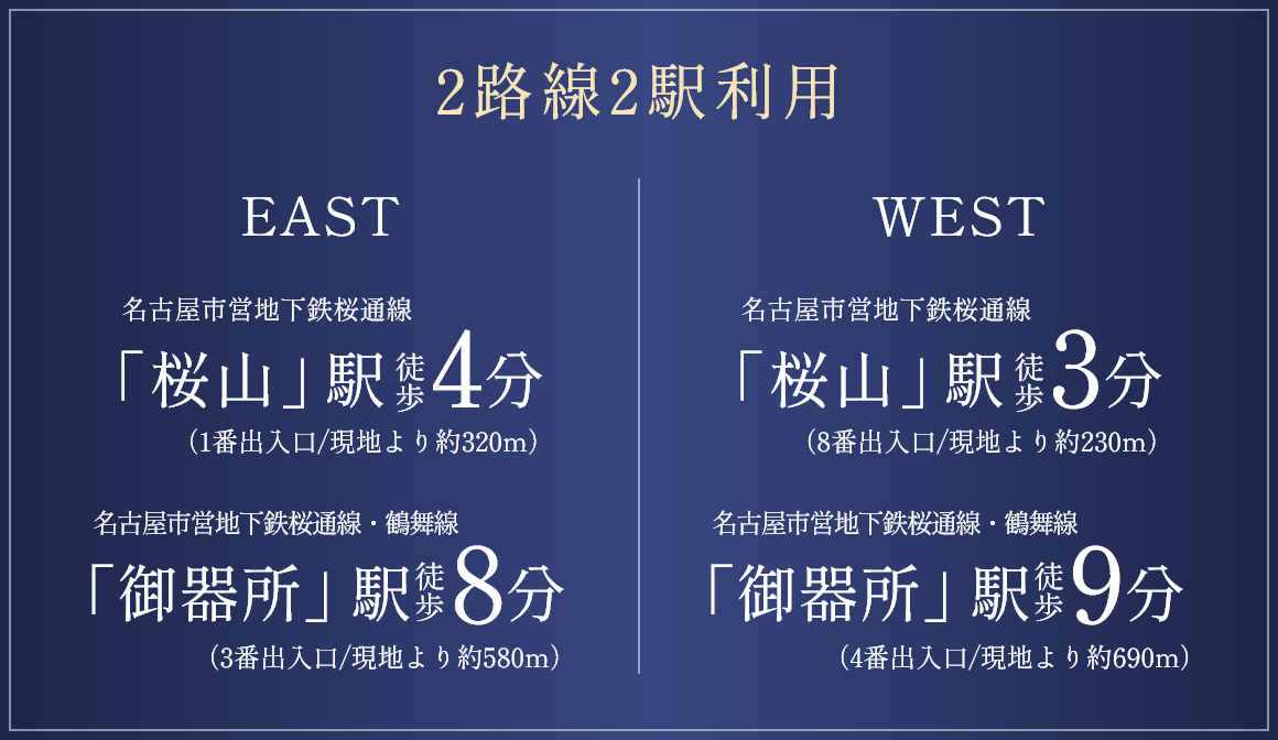 ※名古屋市立大学病院(EAST:徒歩8分/現地より約620m、WEST:徒歩7分/現地より約540m)、鶴舞公園(EAST:徒歩24分/現地より約1,860m、WEST:徒歩25分/現地より約1,960m)