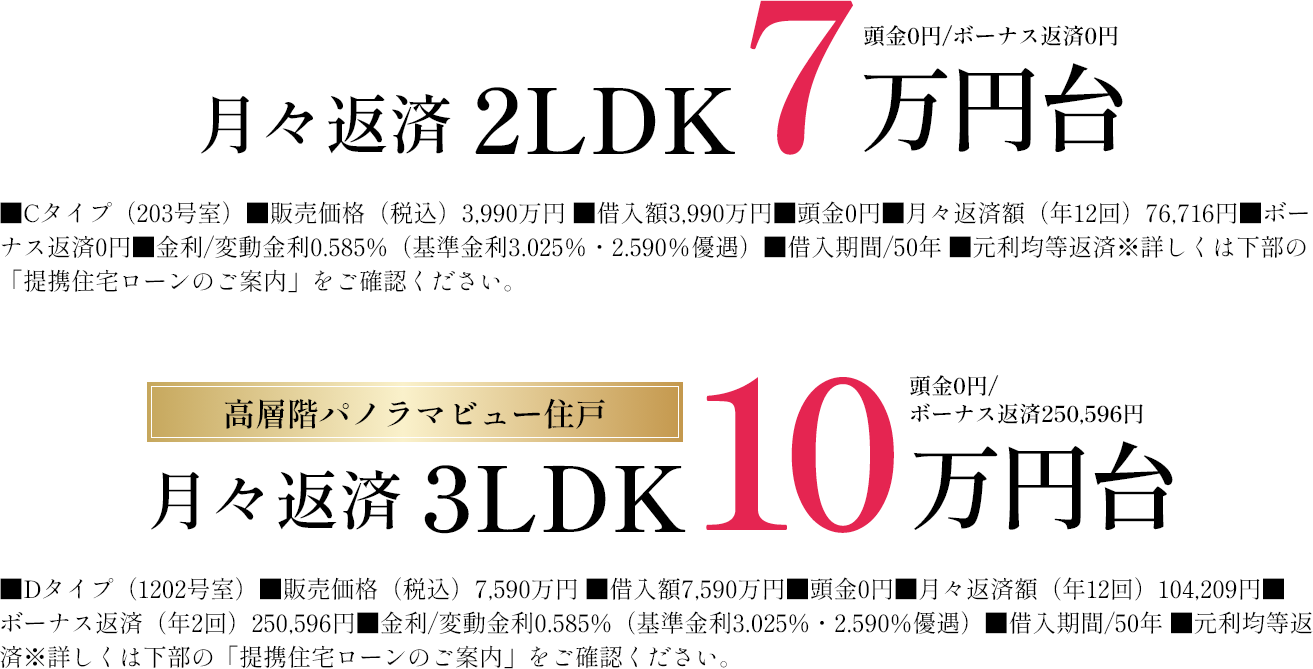 ■提携住宅ローンのご案内●取扱金融機関/住信SBIネット銀行●借入申込資格/○借入時年齢18歳以上65歳未満で最終ご返済時が満80歳未満のお客様○前年の税込年収が100万円以上のお客様○安定した収入が継続して得られる職業・業種の給与取得者で現在の勤続年数が1年以上あるお客様○勤続、営業年数が3年以上の国民健康保険の被保険者である給与所得者、自営業者、会社役員およびこれらに準ずるお客様○過去にローンの延滞、不渡りなどの信用事故のないお客様○団体信用生命保険に加入できるお客様○取扱店の営業区域内に居住または勤続し、担保物件が当社の営業区域内にあるお客様 ●ご融資金額/500万円以上2億円以内(10万円単位) ●ご融資期間/1年以上50年以内(1カ月単位) ●事務手数料/33,000円(消費税込み) ●手数料/融資額の2.2%(消費税込)をお支払いいただきます。 ※諸条件により融資条件は異なる場合がございます。返済例は変動金利年0.585%(基準金利3.025%、優遇金利2.590%適用後)・50年元利均等返済利用のものです。 ※金利は2025年9月8日現在のものです。 ※返済例は、お客様の年齢・収入等諸条件により若干異なる場合があります。金融情勢により、融資条件に変更が生じる場合があります。予めご了承ください。 ※別途、保証料・火災保険加入料が必要となります。詳しくは係員にお尋ねください。