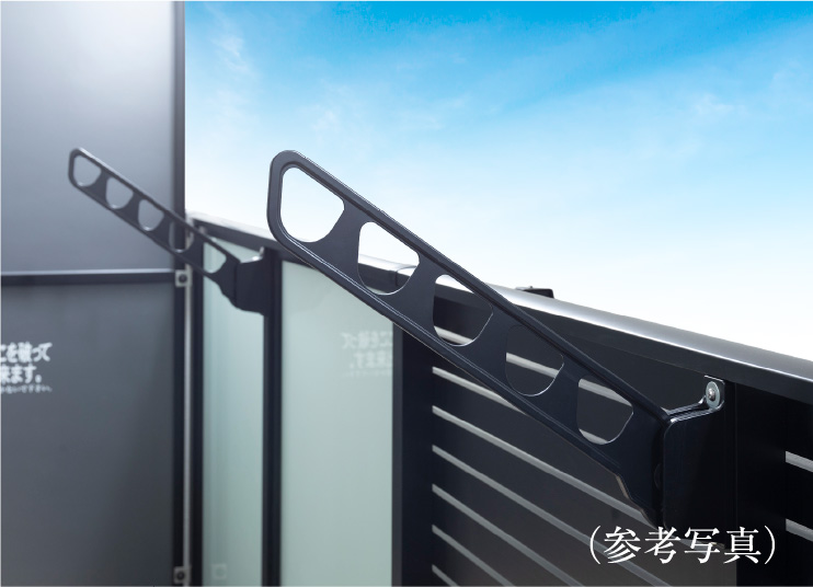ベランダをスッキリと演出するため垂直収納式の物干金物を採用しました。