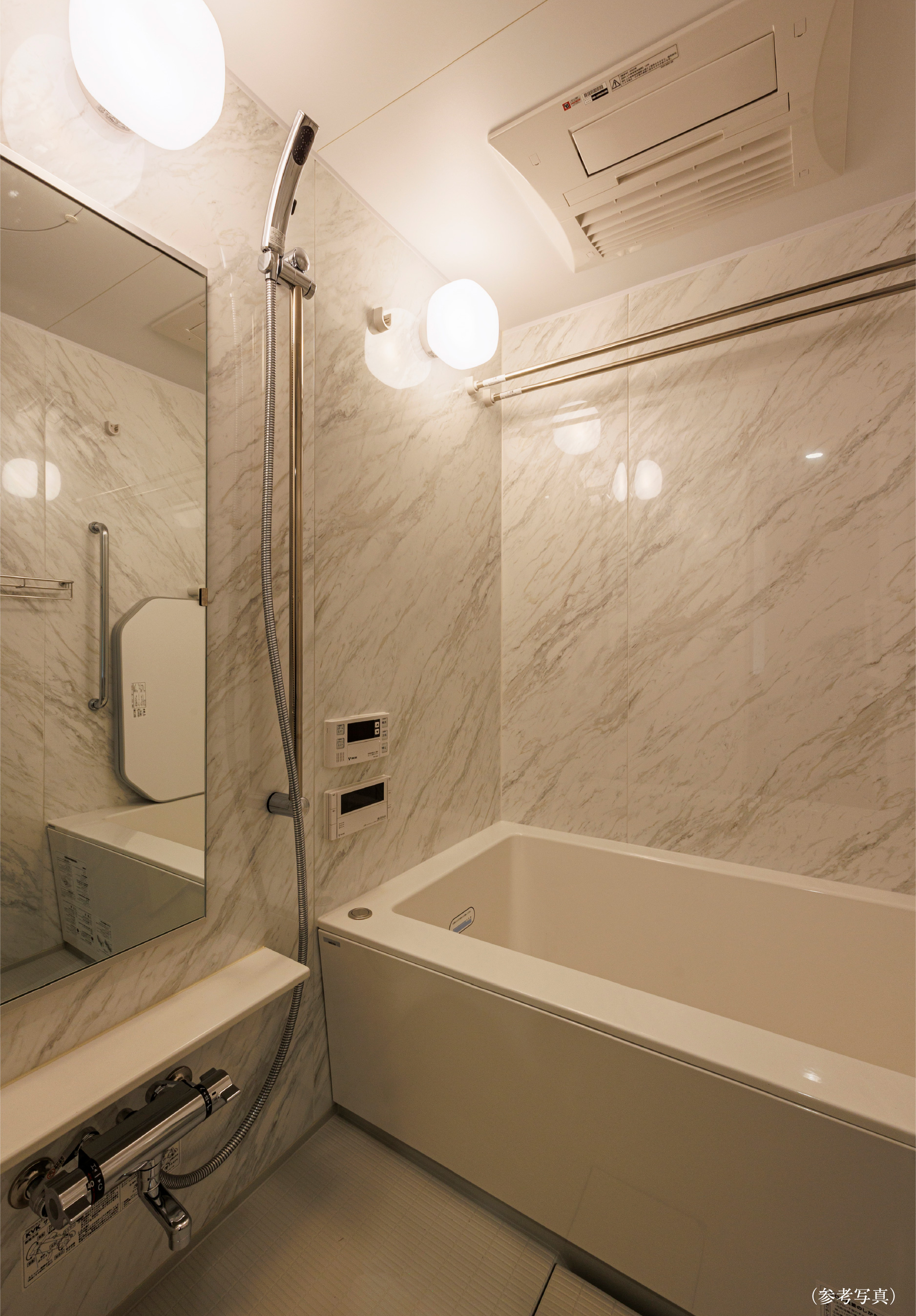 湯温・湯量を調整し、自動お湯はり機能や追い焚き機能のほか、台所リモコンとの通話可能なインターホンタイプを採用。