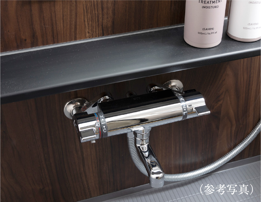 浴室カウンター設定された湯温を安定的にキープして供給するサーモスタット付混合水栓。湯温を簡単に調節できます。また、シャンプーなど小物も置ける浴室カウンターも設置しています。