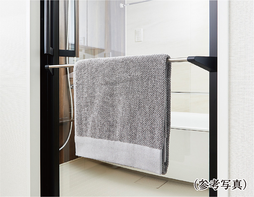 浴室ドアのパウダールーム側にはタオル掛けを設置。バスタオルを掛けて使うことができます。