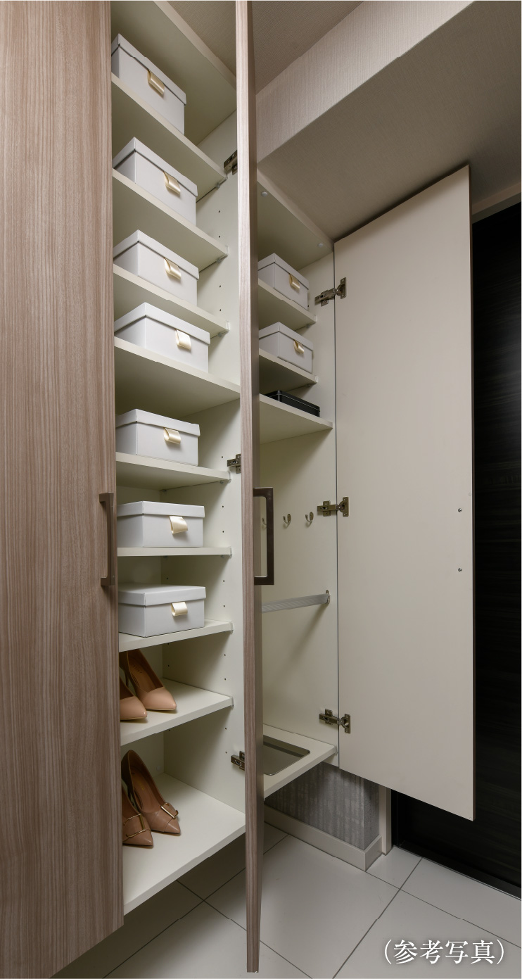 玄関を美しく整理できる収納量の豊かな玄関収納。スペースを調節できる機能的な可動棚を採用しています。