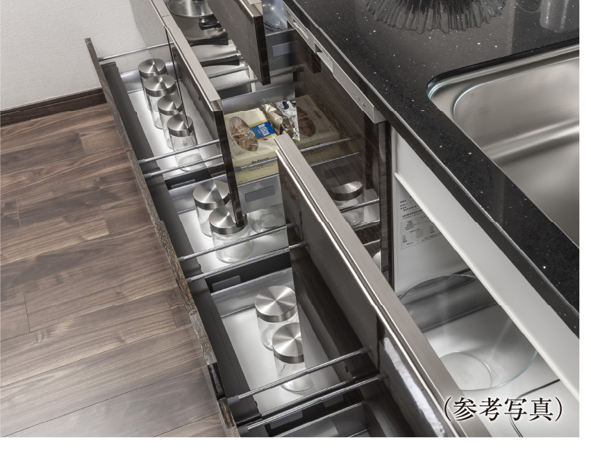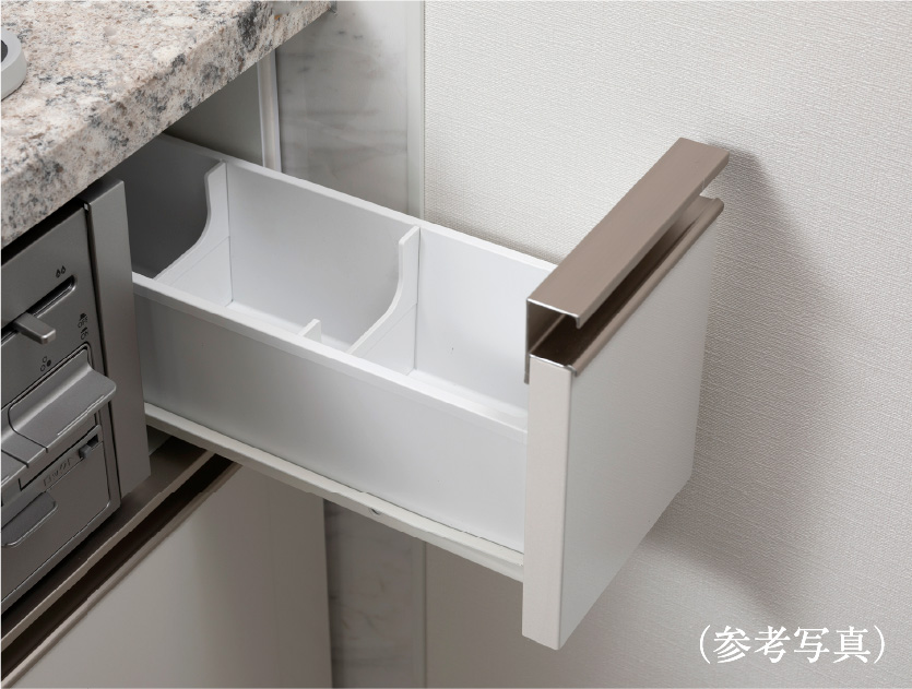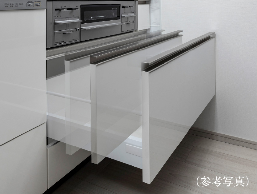 スライド式収納には、ゆっくりと静かに閉まるソフトクローズ設計を採用。食器やガラス製容器も安心して収納できます。