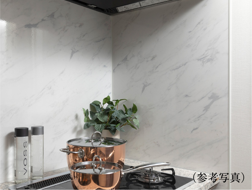 油などが付着しやすいコンロまわりの壁には、油汚れを簡単に落とせるホーローパネルを採用しました。