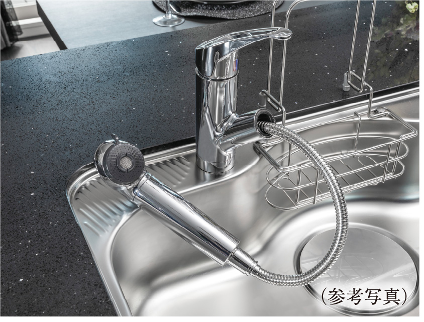 シンク内のお手入れに便利なハンドシャワータイプの水栓。いつでもおいしい水を利用できる浄水器も内蔵しています。