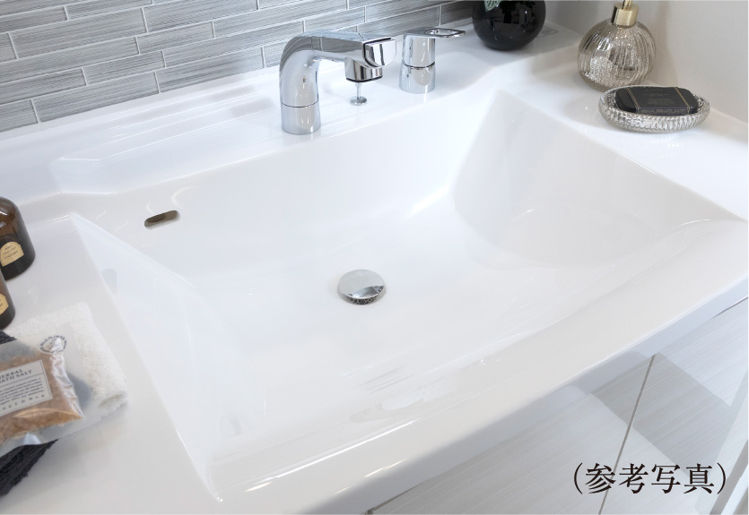 スタイリッシュで、お手入れもしやすい人造大理石仕様のボウル一体型洗面カウンター。