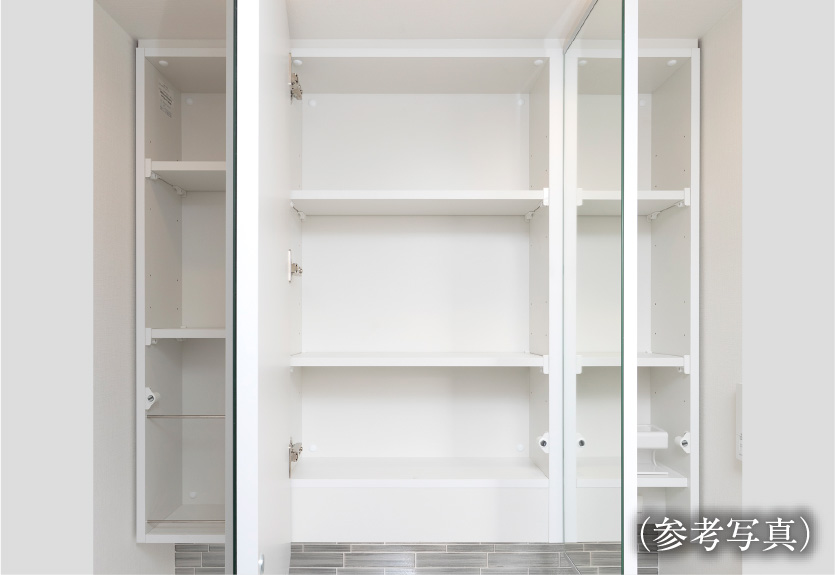 使い勝手のいい三面鏡。小物などを収納するスペースを鏡裏に確保しました。