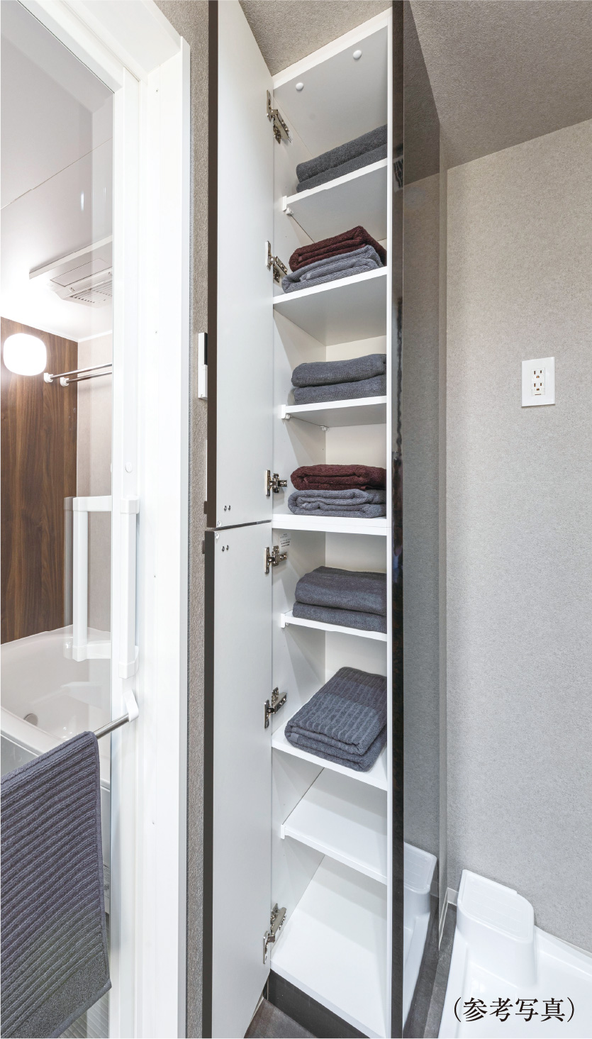 タオル類などの収納に便利なリネン庫をパウダールームに設けました。
