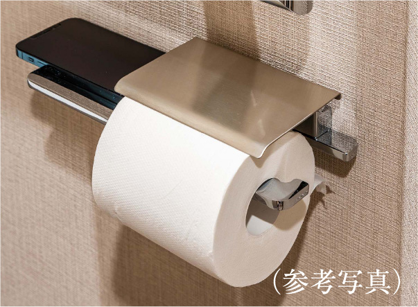 ペーパーホルダーペーパーホルダーには、スマートフォンなどを一時的に置ける小物置を設けました。