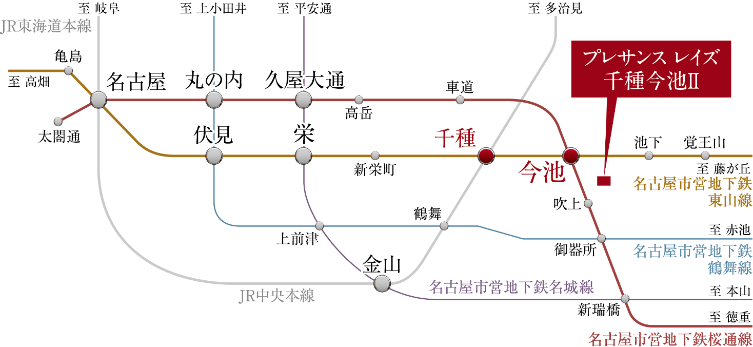 名古屋市営地下鉄東山線と桜通線が利用でき、「名古屋」「栄」「久屋大通」※4など