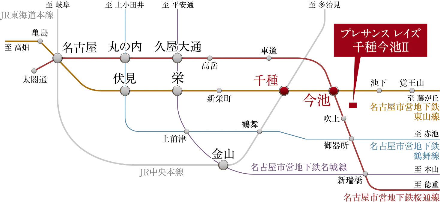 名古屋市営地下鉄東山線と桜通線が利用でき、「名古屋」「栄」「久屋大通」※4など