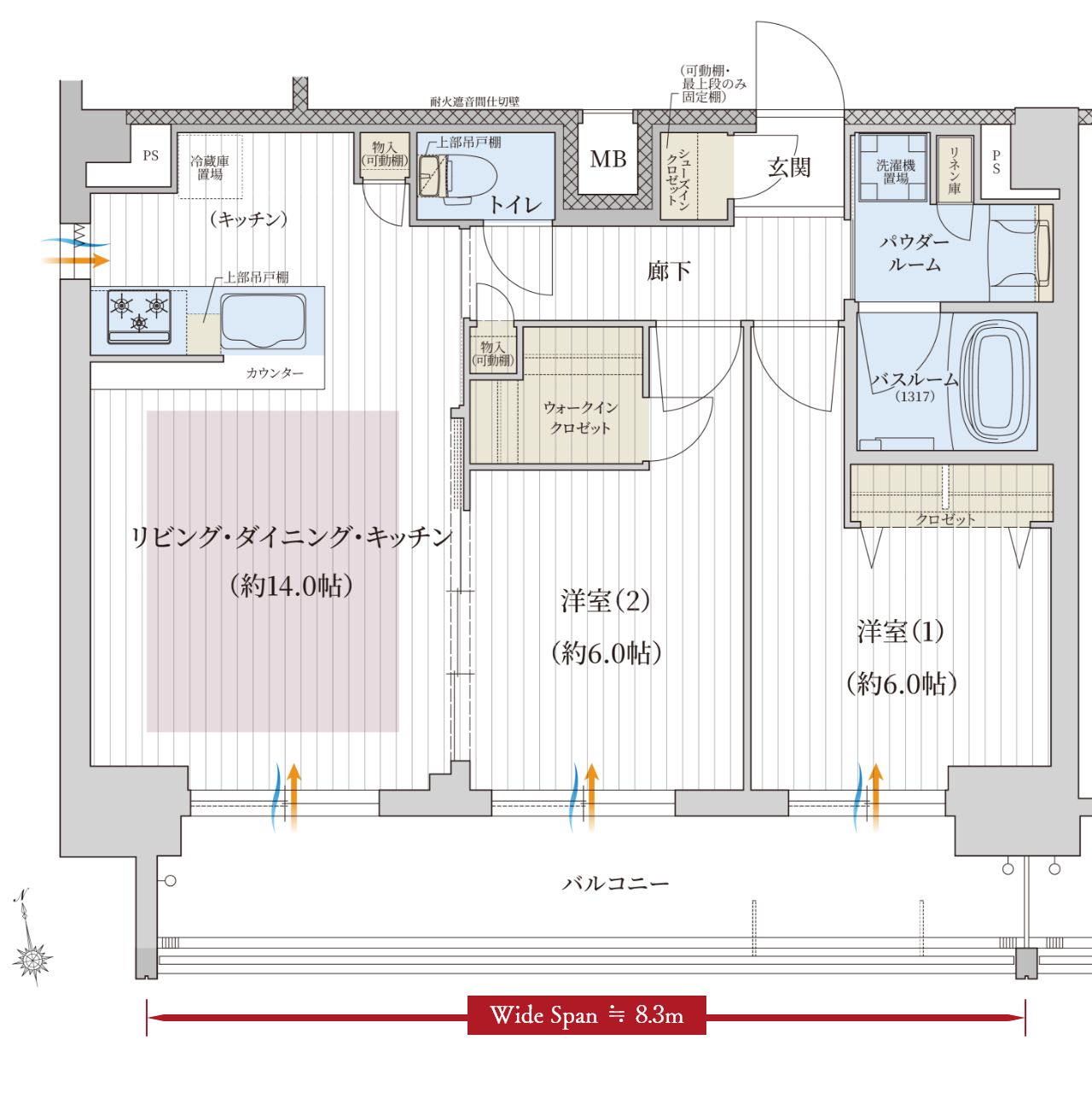 • 効率の良い間取りを実現する、約8.3mのワイドスパンで収納スペースが充実の南向き2LDKプラン。