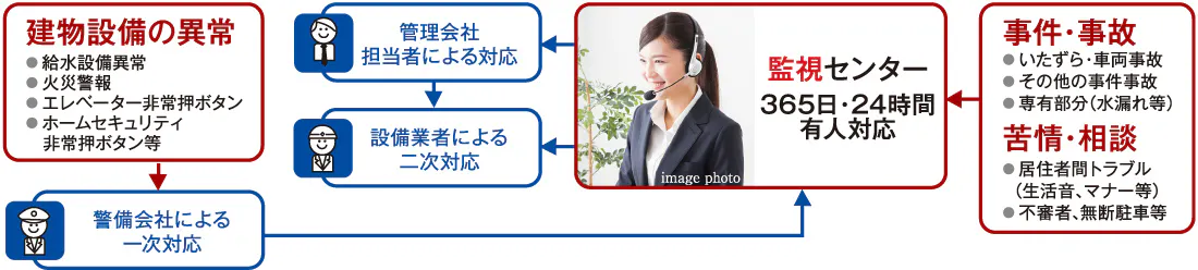 管理組合や居住者からの連絡や相談、設備の異常や事故・トラブルなどの緊急事態に備えて、365日24時間体制で管理会社の緊急連絡センター(フリーダイヤル)が対応いたしますので安心です。問い合わせや対応状況などは、管理会社独自のシステムに登録され、一元的に集約・管理されています。