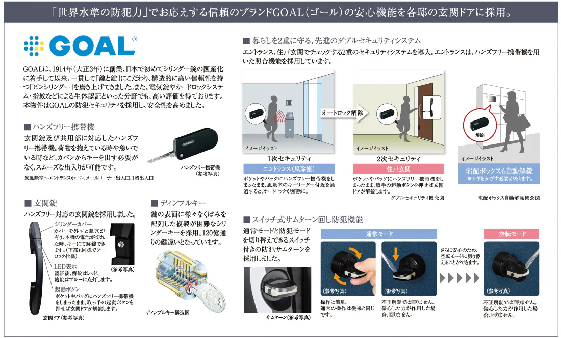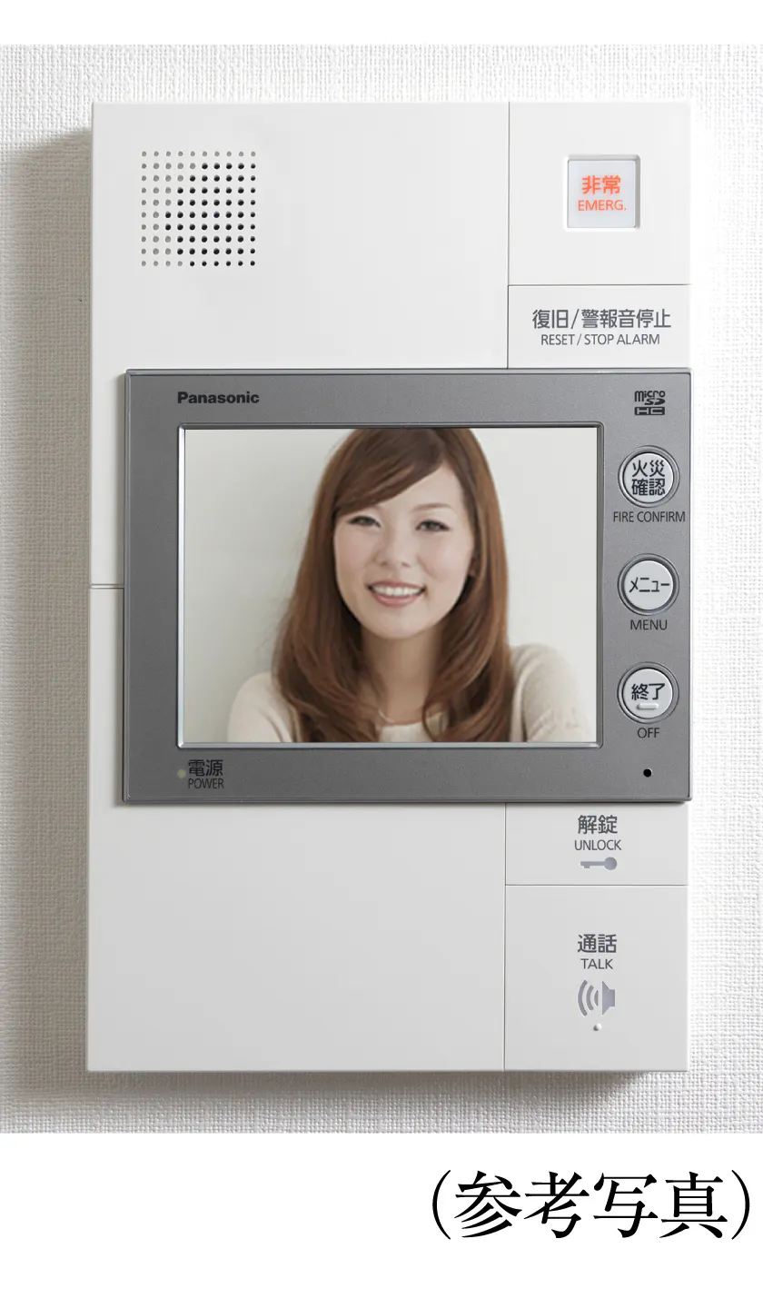 各住戸のリビングに設置されたカラーモニター付インターホンから、エントランスの集合玄関扉の解錠ができるオートロックシステム。来訪者を映像と音声で確認できるので、不審者の侵入を困難にし、煩わしいセールスマンにも住戸内で対応できます。