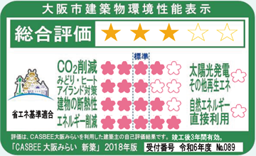建築主が大阪市に提出する建築物環境計画書によって、建築物の長寿命化などの3つの項目に対する取り組み度合いと、建築物の環境性能を総合的に5段階で評価しています。